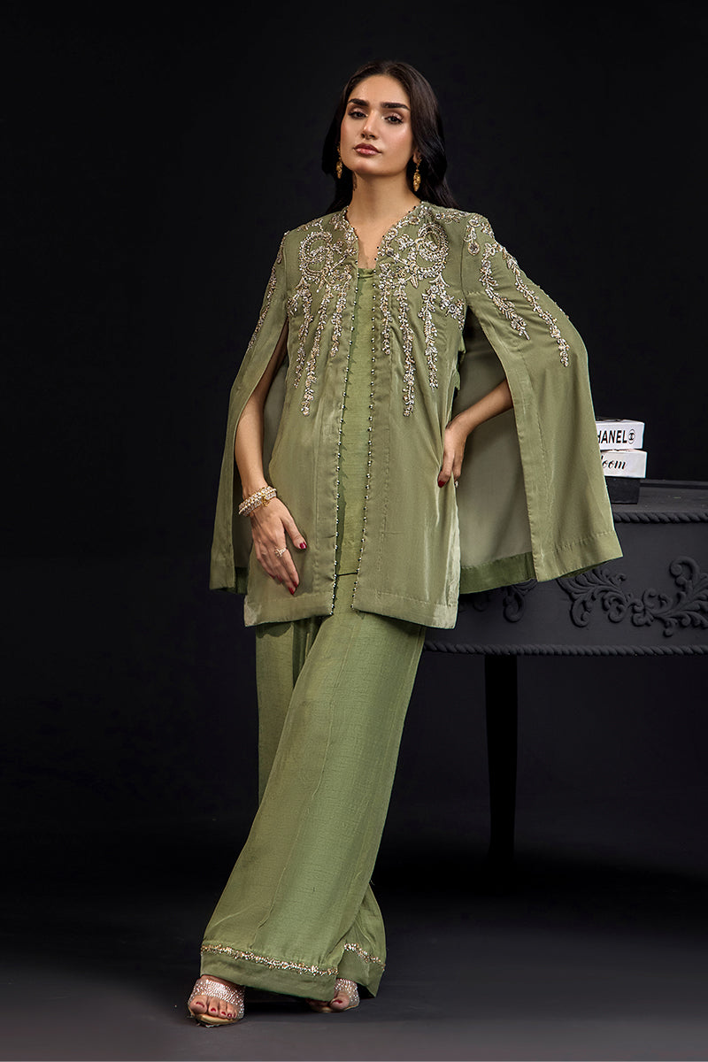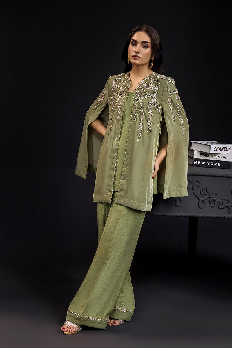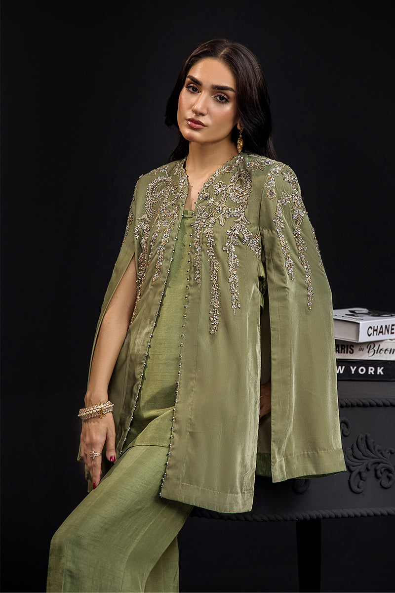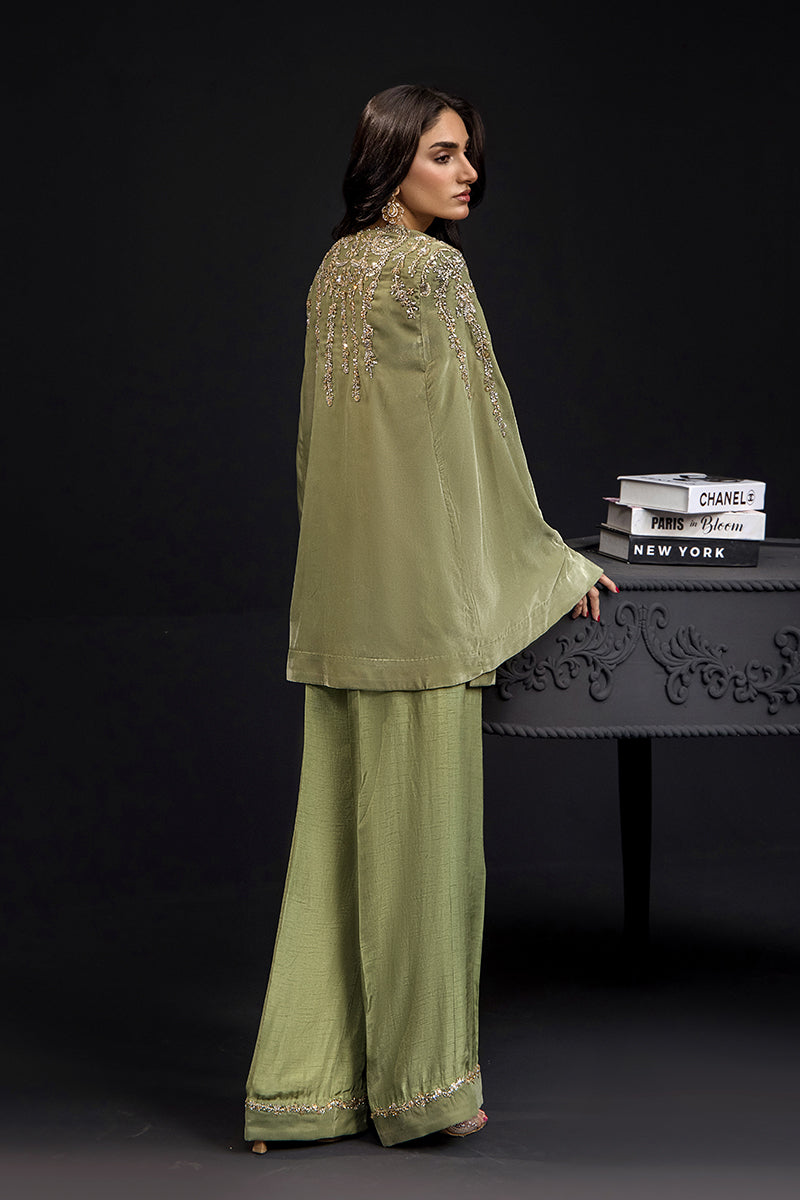 This sophisticated sage green ensemble features a cape-style top with intricate silver and gold beadwork in paisley and floral patterns throughout. The V-neckline cape design creates elegant draping over a fitted inner top, paired with matching straight pants. The muted olive-green tone is beautifully complemented by the metallic embellishments, making it perfect for daytime celebrations and semi-formal gatherings.