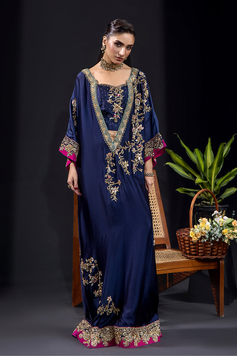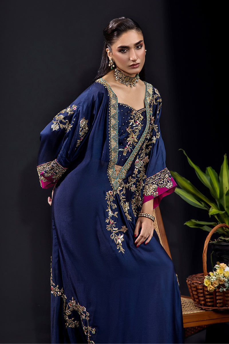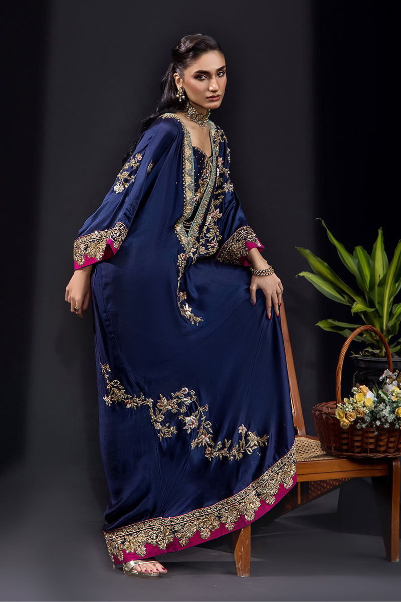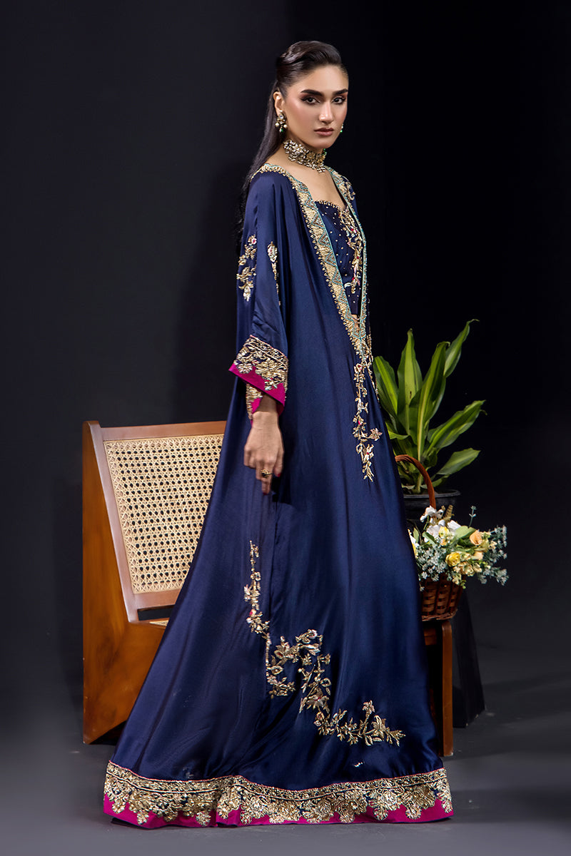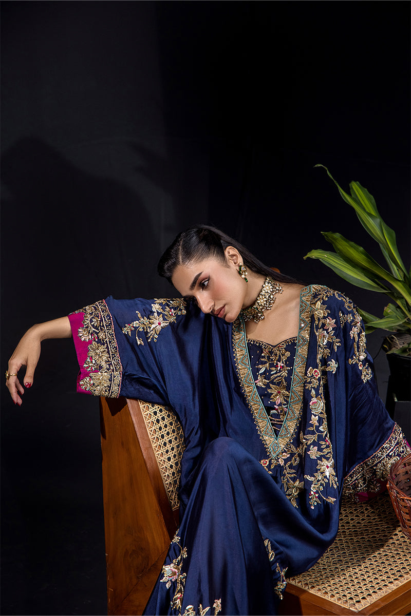 An opulent gown-style creation crafted from pure silk tissue, this deep navy ensemble captures the essence of refined luxury. Adorned with exquisite kora, dabka, sequins, fine resham work, crystals, Swarovski elements, and intricate French knots, it radiates regal charm and meticulous craftsmanship. The detailed gold embroidery beautifully complements the rich magenta borders, adding a touch of grandeur.