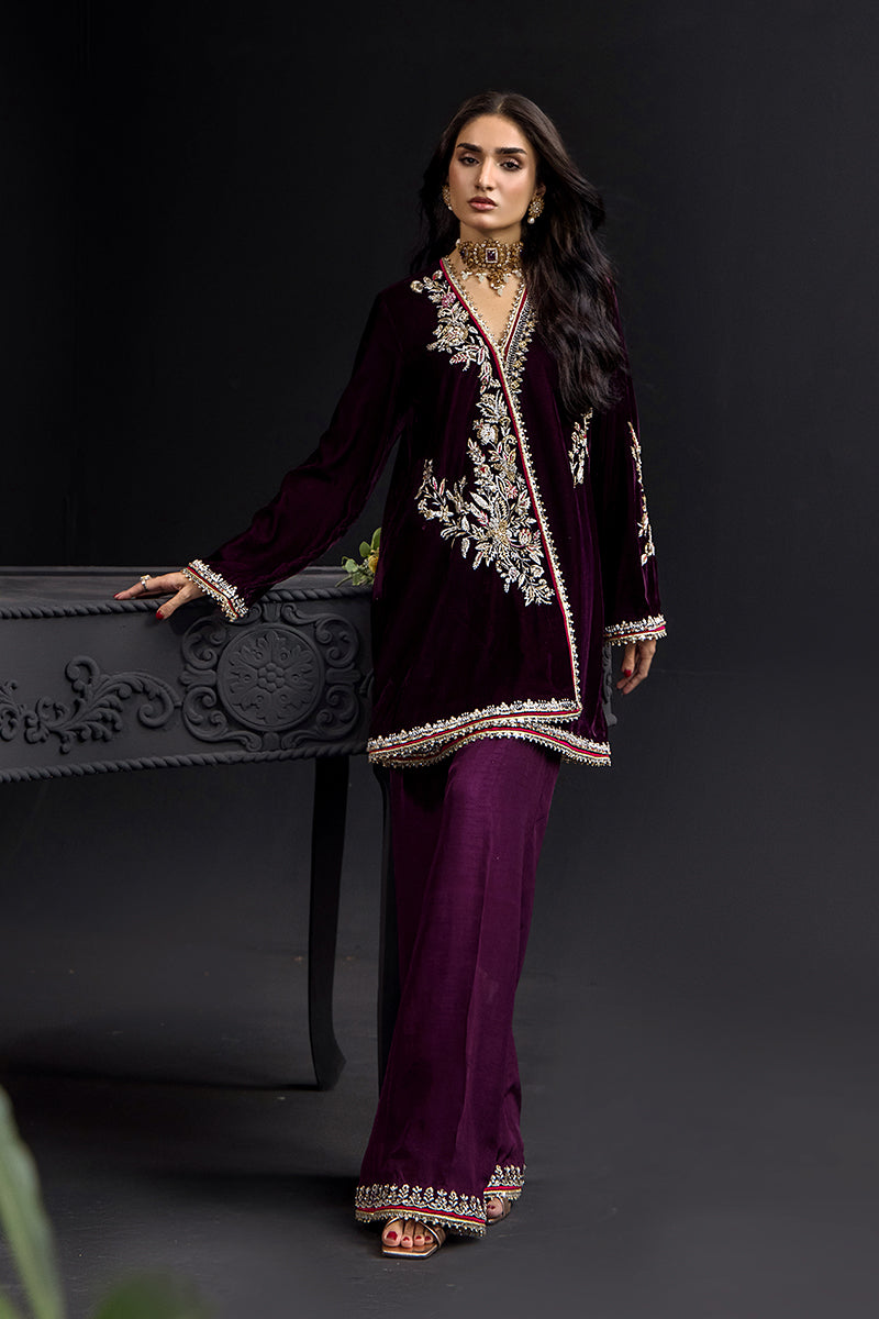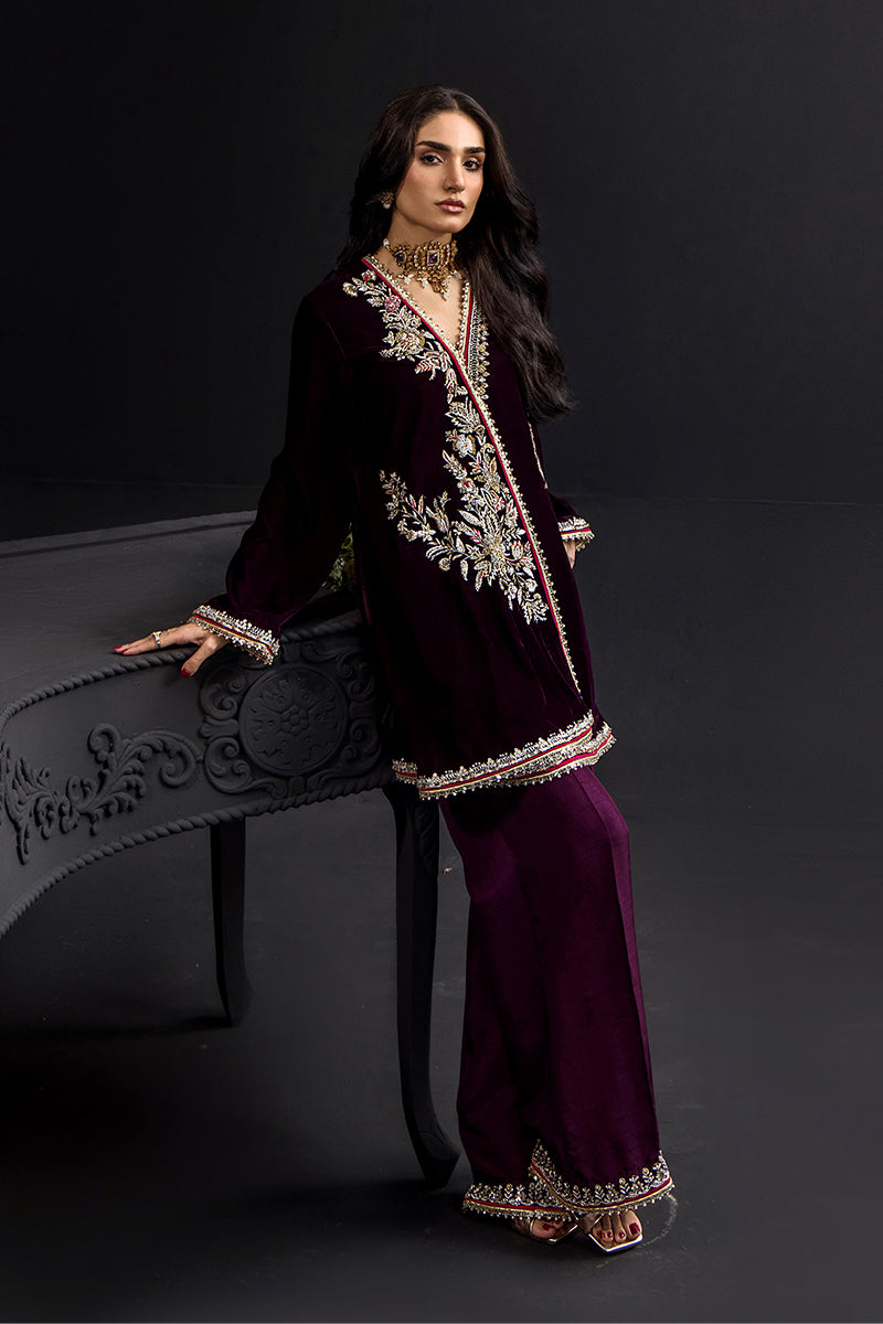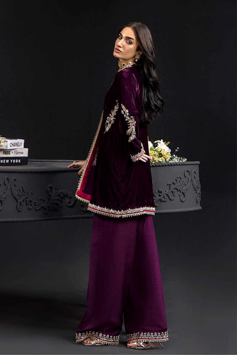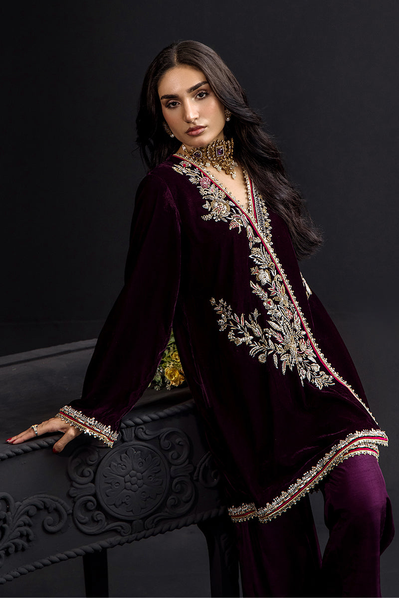 A luxurious short kurta in rich plum velvet featuring a deep V-neckline with heavily embellished front panel. The design showcases elaborate floral embroidery in gold and silver threads cascading down the front, with long sleeves featuring ornate embellished borders. Paired with matching straight pants, this hip-length contemporary piece is perfect for semi-formal events and dinner parties.