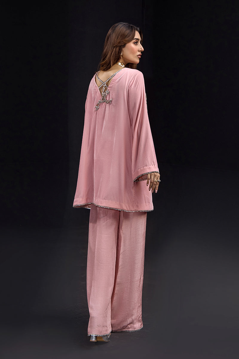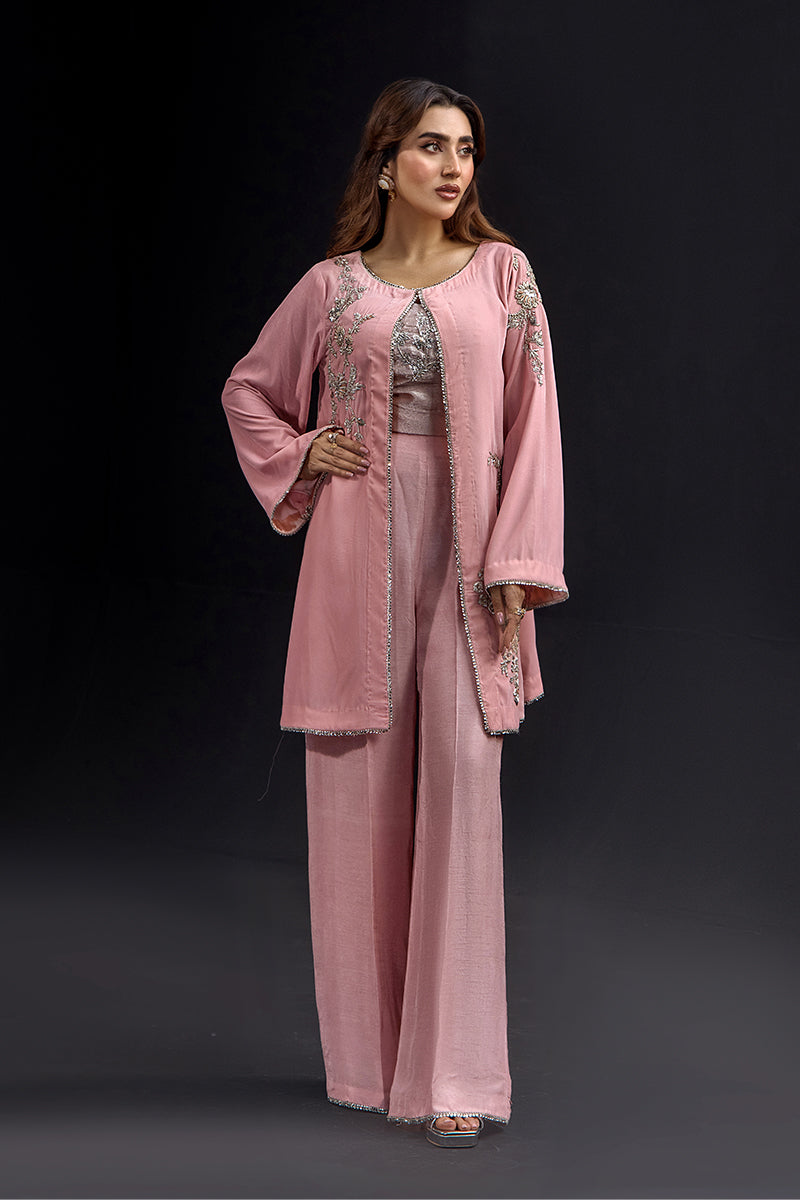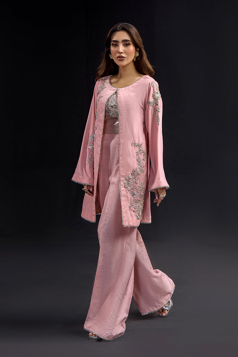 A romantic three-piece ensemble in soft blush pink velvet featuring a fitted crop top, wide-leg palazzo pants, and matching long jacket. The outfit is adorned with sparkling rose gold sequins and thread work throughout, with scattered floral embellishments on the flowing jacket sleeves. This contemporary silhouette with traditional embellishment techniques is ideal for weddings and special celebrations.