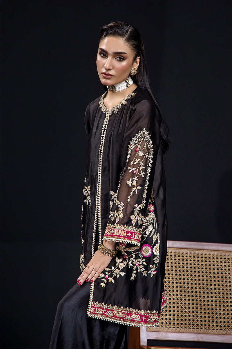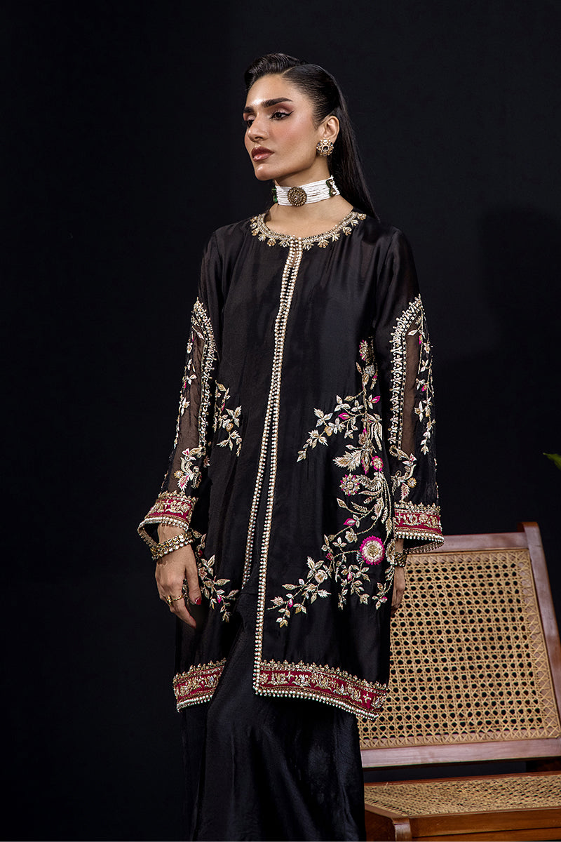 A striking black short shirt ensemble crafted from pure tissue silk, paired with a sleek flared trouser for a modern yet timeless silhouette. The outfit features exquisite embroidery in hues of antique gold and deep rose, brought to life with intricate kora, dabka, sequins, fine resham work, crystals, Swarovski elements, and delicate French knots. Each motif is meticulously detailed along the sleeves, hem, and borders, creating a look that embodies sophistication and grace.