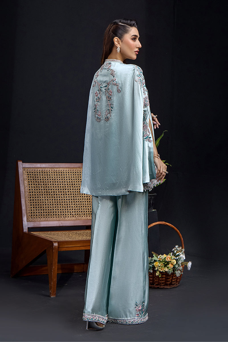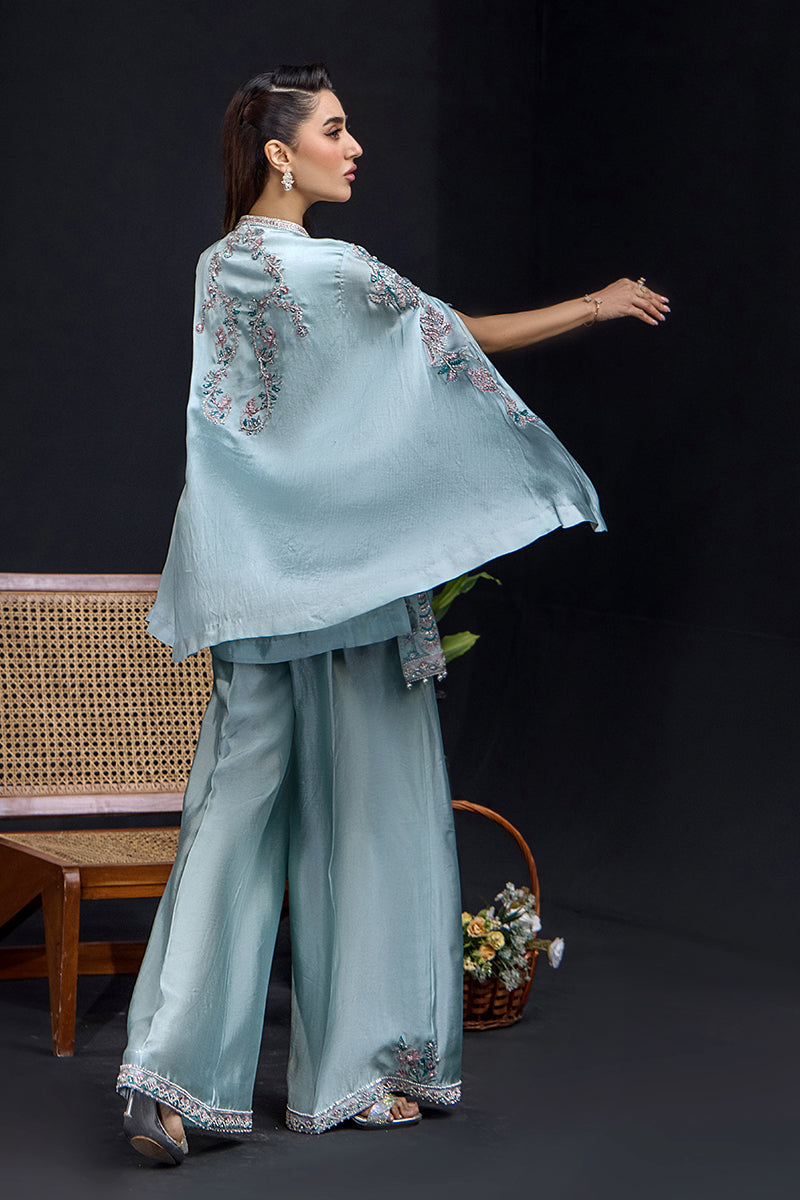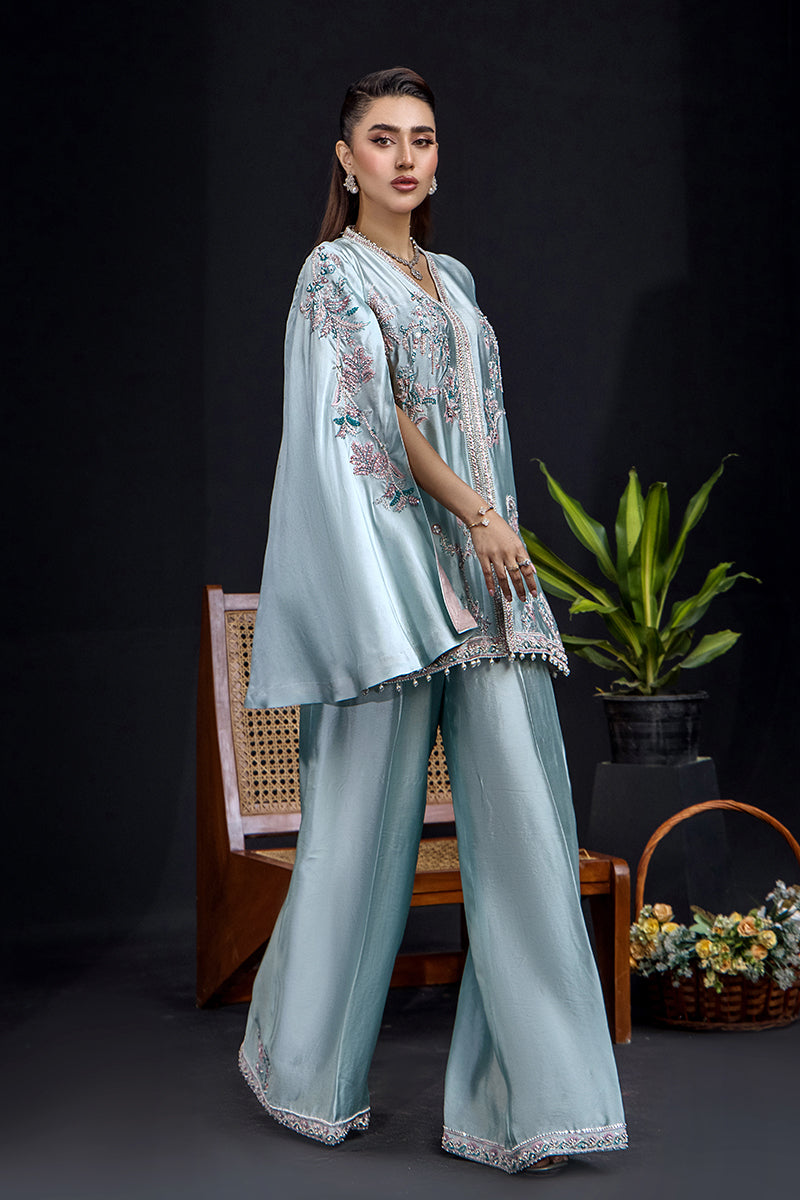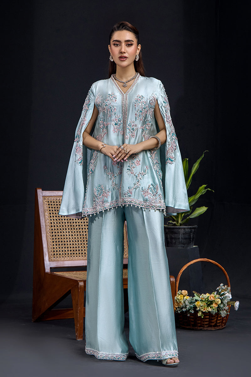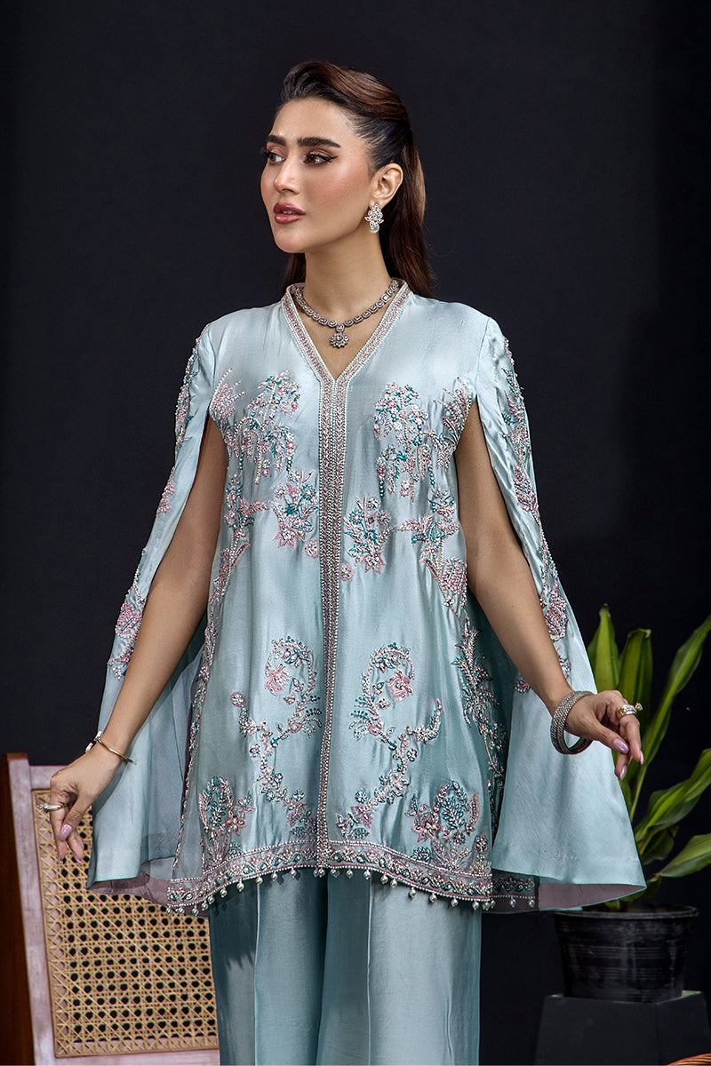A mesmerizing creation in a soft pastel ice blue hue, crafted from pure tissue silk. This contemporary cape-style shirt with cut sleeves exudes modern elegance while maintaining a graceful traditional charm. The ensemble is beautifully adorned with delicate embroidery in pastel pink, silver, and mint tones, featuring intricate kora, dabka, sequins, fine resham work, crystals, Swarovski elements, and French knots. Paired with wide-leg pants, this look perfectly balances sophistication and effortless style