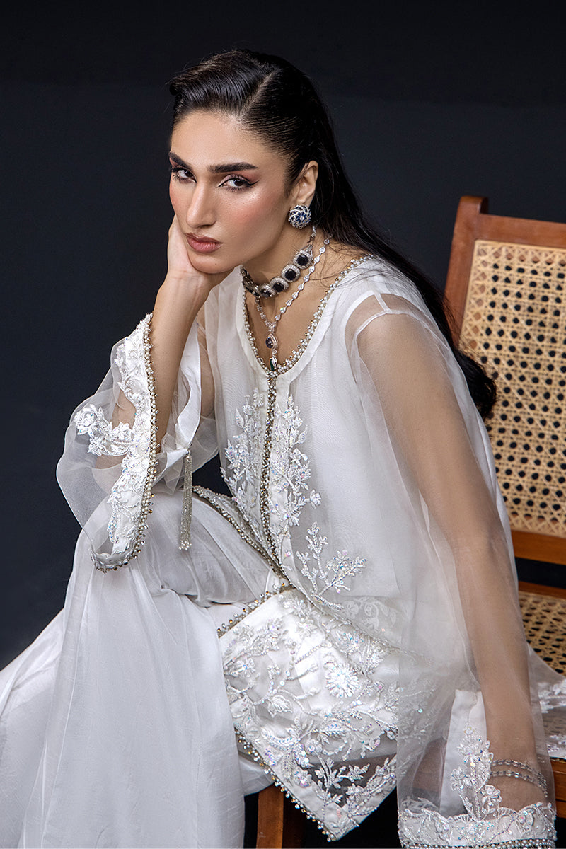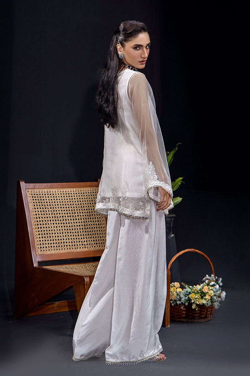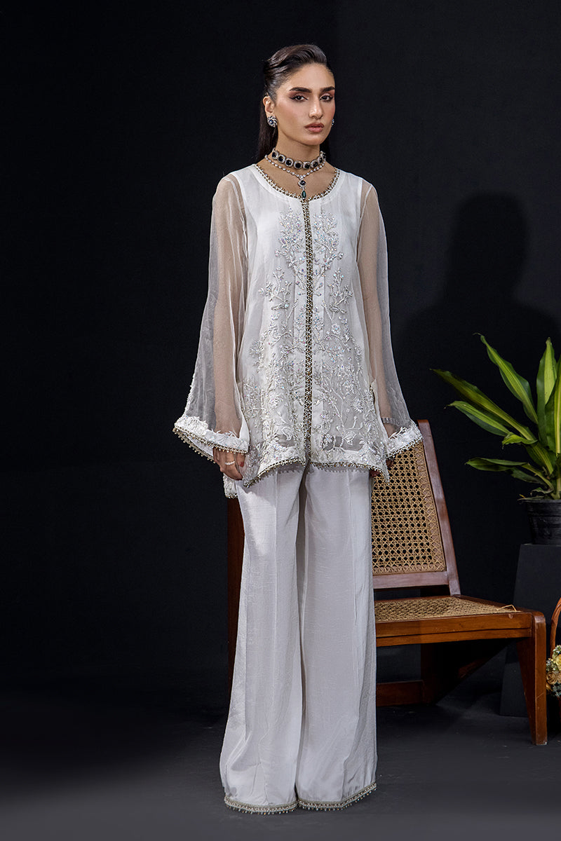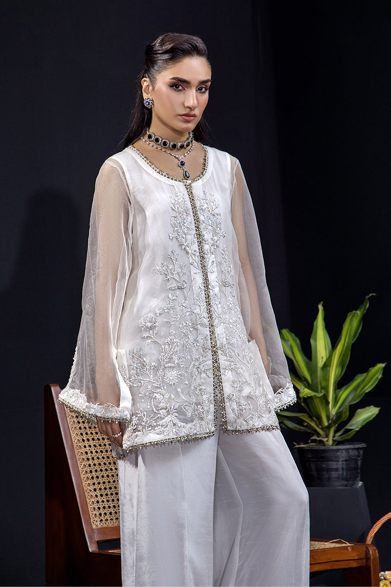 An ethereal vision in white, this ensemble is crafted from pure tissue silk, paired with simple yet graceful pants. The short shirt features a delicately embroidered organza overlay, adorned with exquisite kora, dabka, sequins, fine resham work, crystals, Swarovski elements, and intricate French knots. Each detail adds a subtle sparkle, creating a look that exudes refined sophistication. Perfect for festive occasions or elegant soirées,